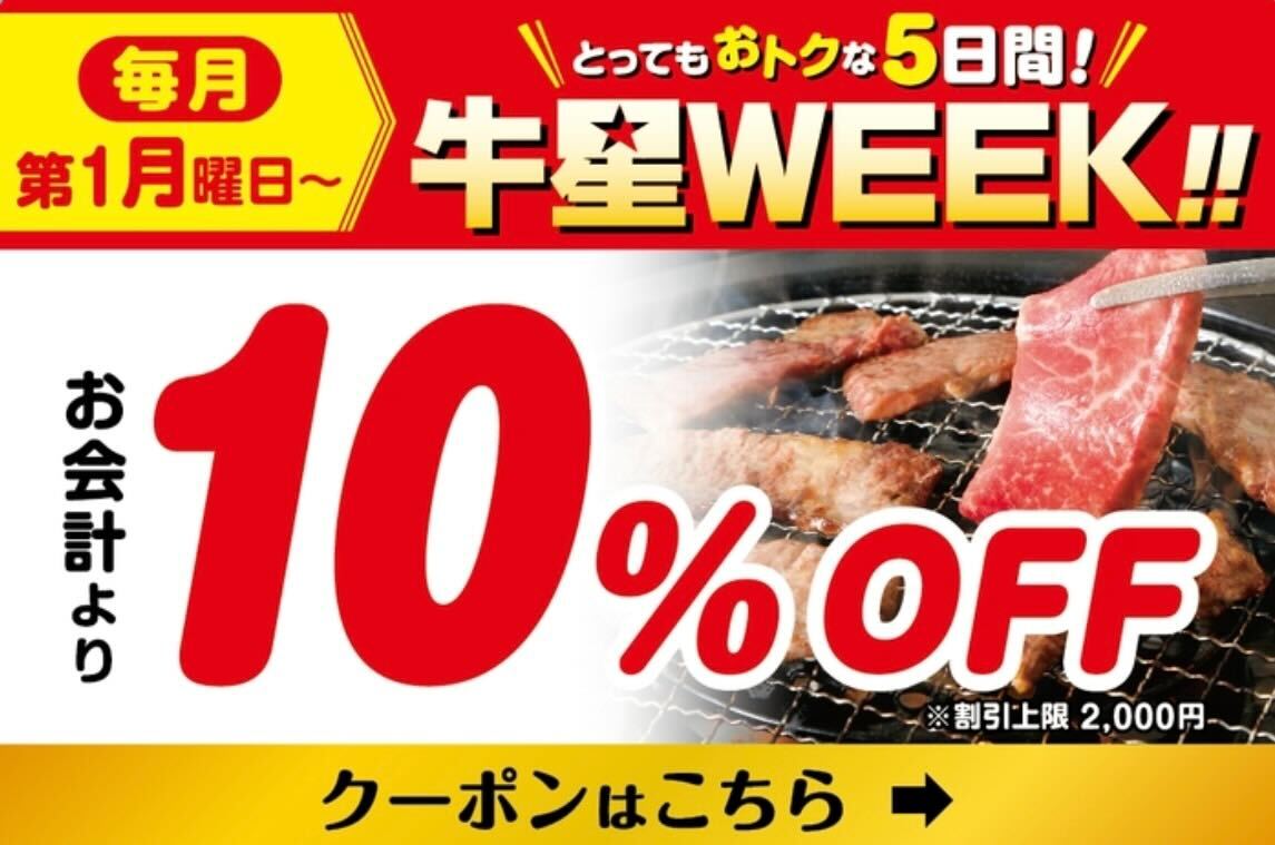 🐮今日は焼肉を食べよう!「牛星WEEK」開催! 毎月第一月曜〜金曜日は、いつものお会計がグッとおトクに✨ 【利用条件】 ・他クー…