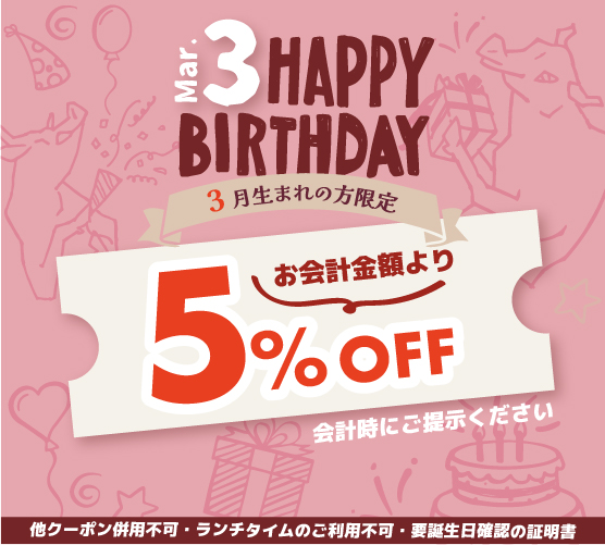 今回は【3月】生まれのLINE友だちの皆様へクーポンをお届け! 【利用条件】 ・他クーポン併用不可 ・会計時にご提示ください ・…